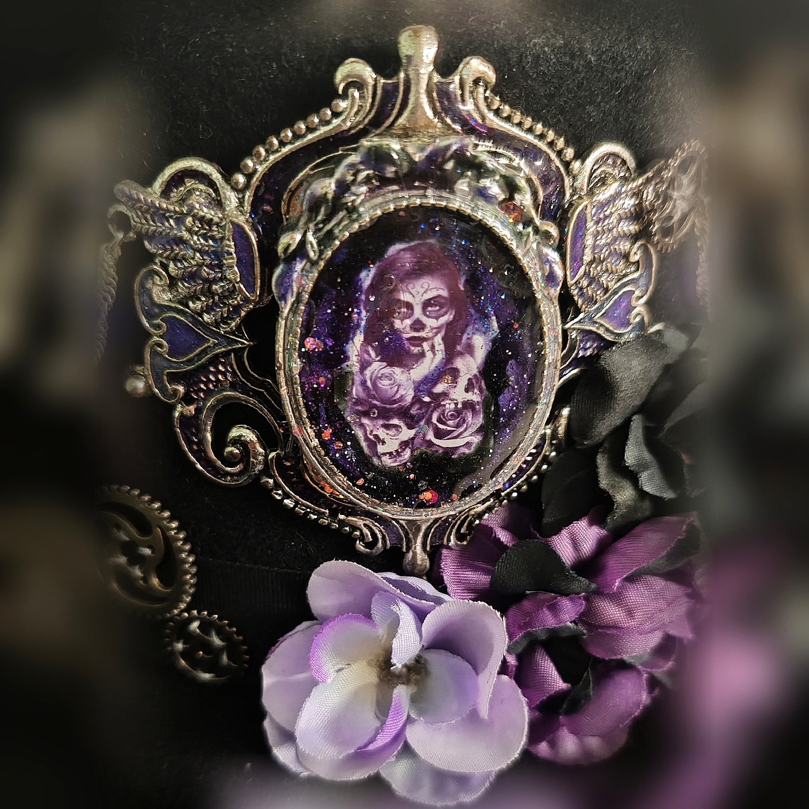 Une cascade de chaînettes et d’engrenages en métal argenté apporte une vibration steampunk assumée, tandis qu’une profusion de fleurs en tissu, déclinées en violet, lilas et lavande, habille le bord du chapeau. Des perles nacrées ponctuent l’ensemble et captent la lumière comme autant de secrets murmurés.