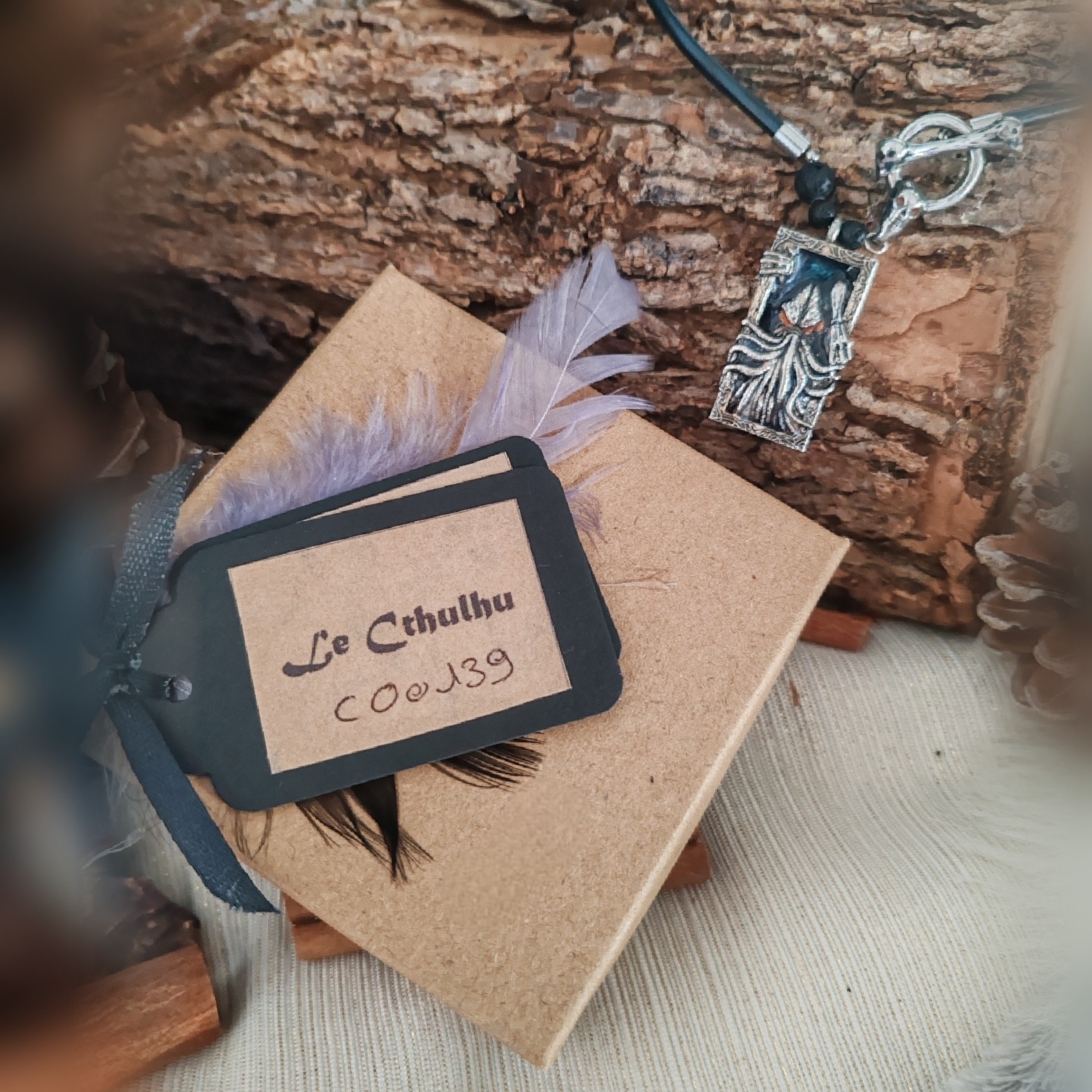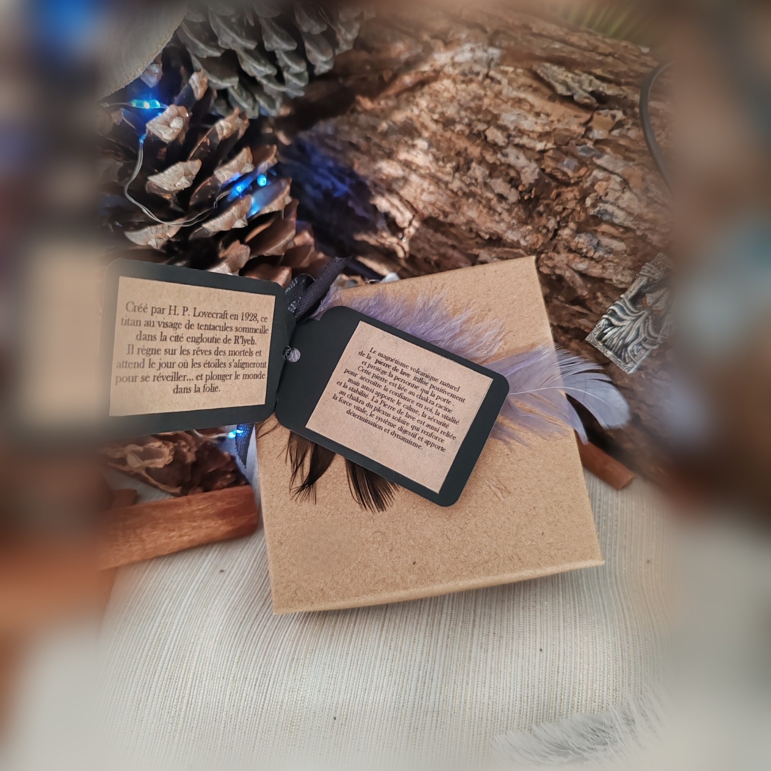 Chaque collier Le Cthulhu est livré dans un écrin en kraft personnalisé, accompagné de sa carte d’identification numérotée et de sa carte de lithothérapie, soulignant l’attention portée aux moindres détails.