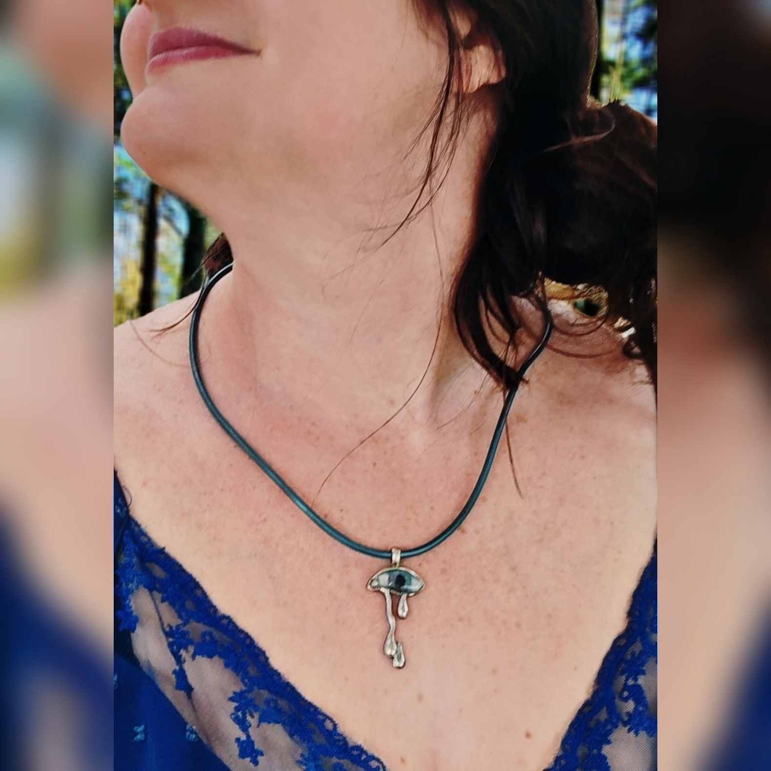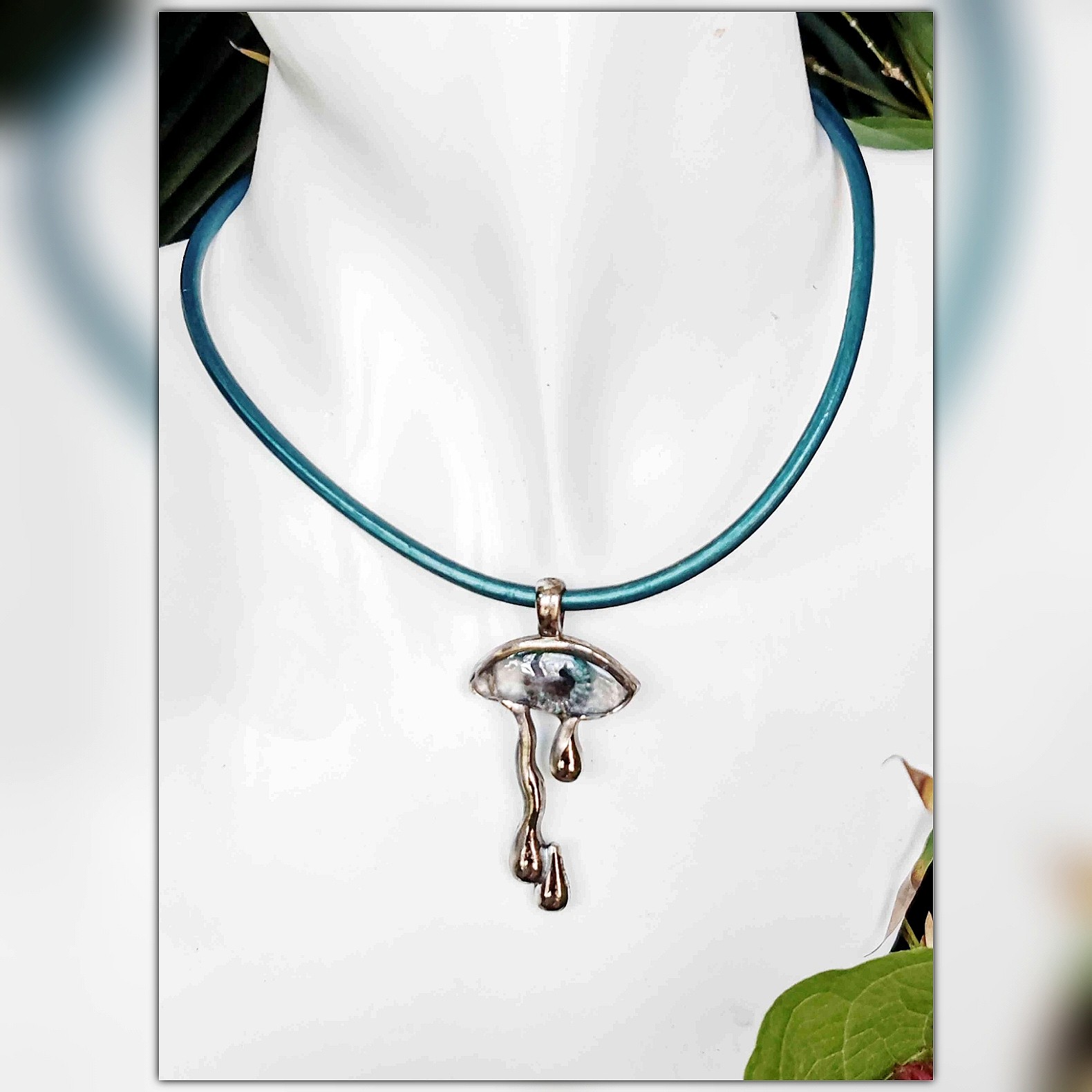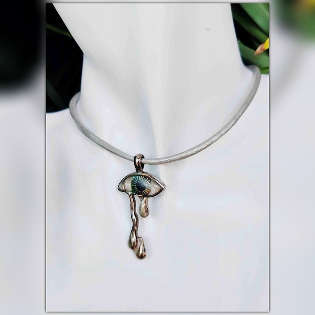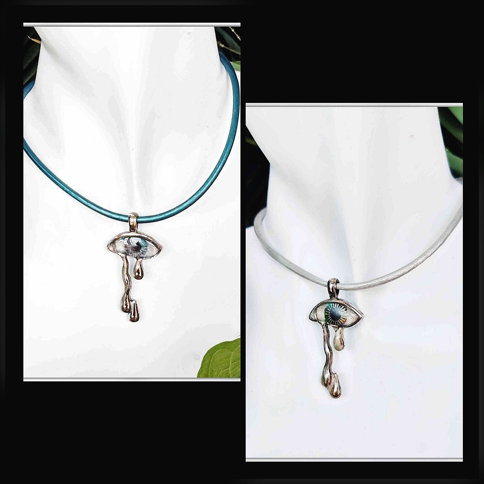 Plongez dans l’univers fascinant de La Dame Blanche, une collection de colliers au charme énigmatique où chaque détail raconte une histoire. Conçus à partir d’acier inoxydable poli et de cuir vernis coloré, ces colliers jouent subtilement sur les contrastes entre la froideur métallique et la chaleur sensuelle du cuir. Le véritable point d’orgue ? Un pendentif en forme d’œil qui pleure, émaillé à la main par mes soins dans des nuances exclusives pour créer un effet hyperréaliste : des éclats de lumière capturés dans les iris, une larme suspendue à la frontière du rêve et de la réalité.