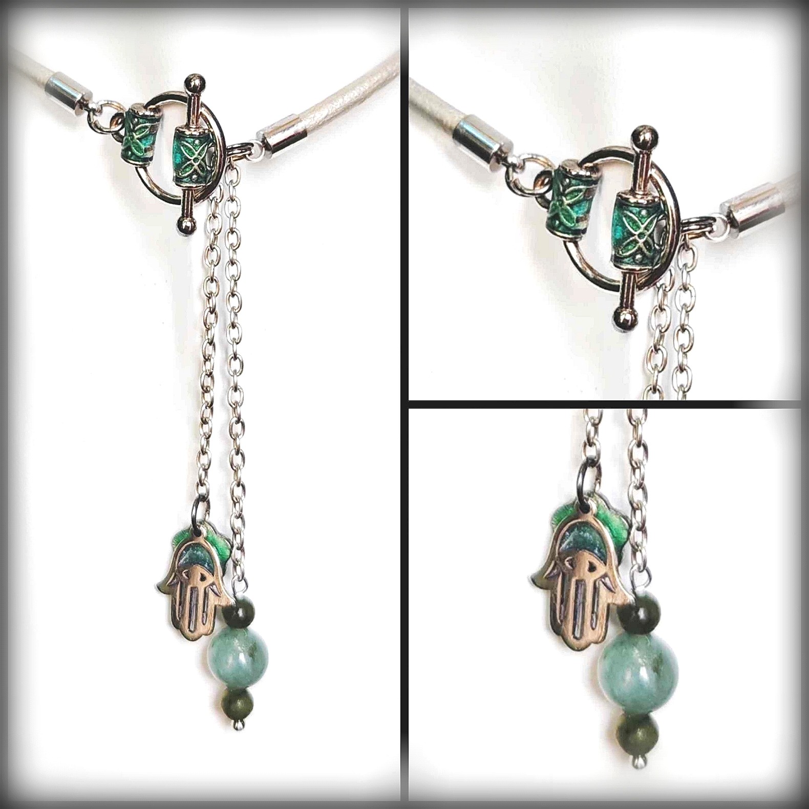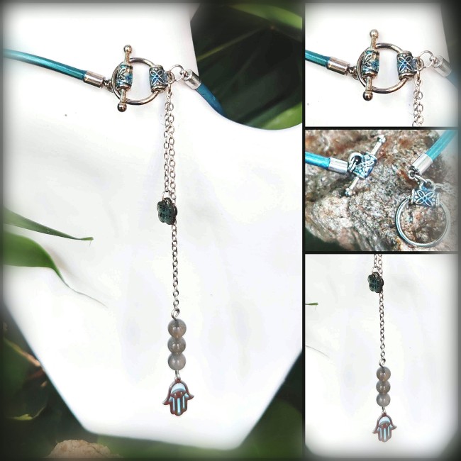 Chaque collier repose sur un cordon en cuir vernis, minutieusement assorti à la teinte de l’émail du pendentif, pour offrir une harmonie chromatique intérieure et extérieure. Les embouts en acier, finition miroir, encadrent le cordon avec élégance, tandis que la fermeture originale en "T" apporte une touche d’audace et de modernité. Autour de cette fermeture, une chaîne d’embellissement en acier enlace une perle en gemme véritable et une petite main de protection émaillée, faisant écho aux couleurs de l’iris et ajoutant une dimension symbolique invitant à la bienveillance et à la force intérieure.
