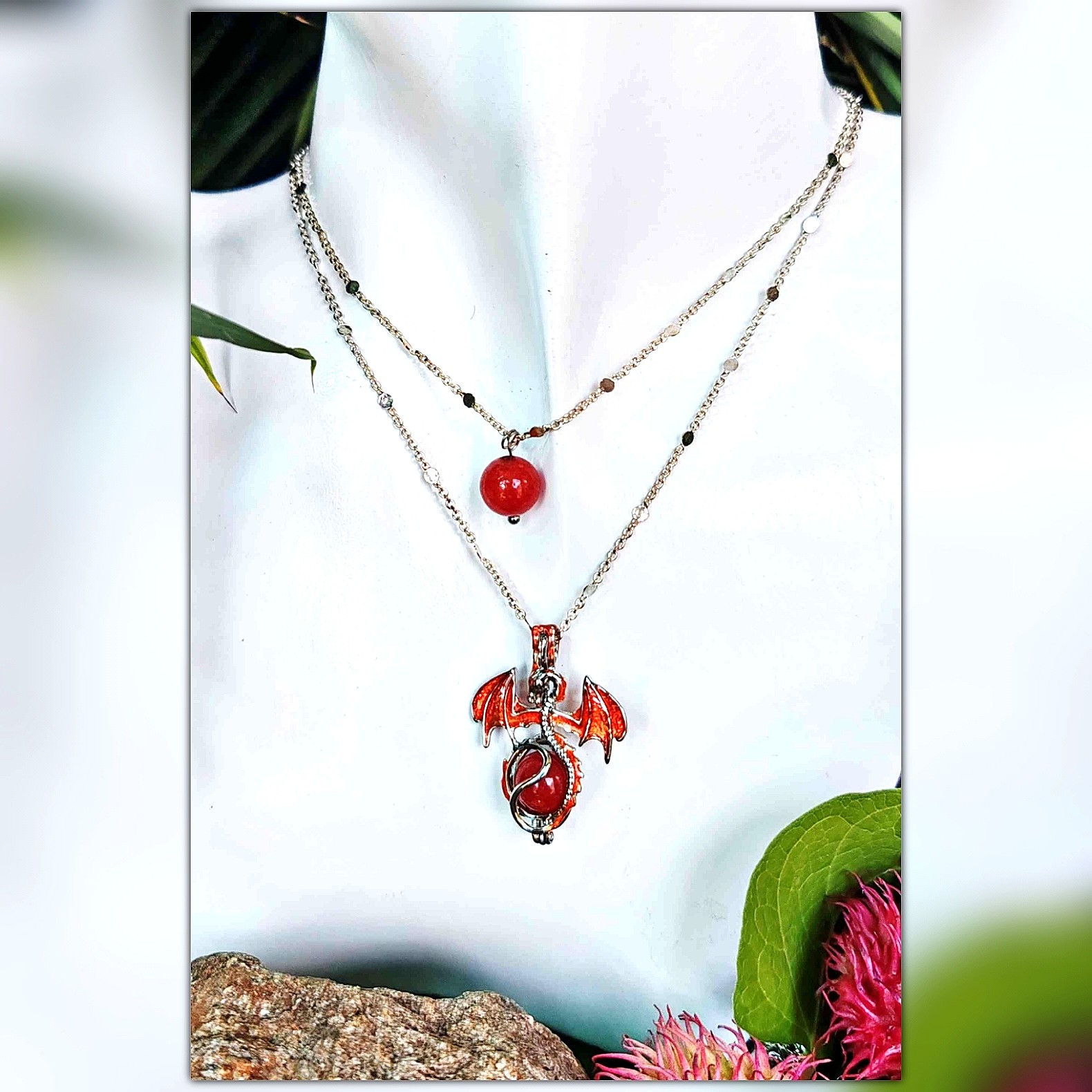 Son double sautoir en acier argenté, fin et lumineux, enlace deux puissances. Sur la première chaîne, une perle de Cornaline flamboie comme le cœur d’un volcan. Sur la seconde, plus longue, un dragon émaillé d’orange, protecteur ancestral, porte sa propre pierre ardente, symbole de vitalité et de courage.