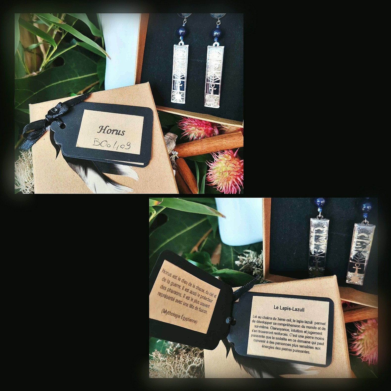Chaque paire est présentée dans son écrin personnalisé, accompagnée de sa carte d’identification et de sa carte de lithothérapie, pour faire de ce bijou non seulement une parure, mais un talisman protecteur, digne de l’Œil d’Horus lui-même.