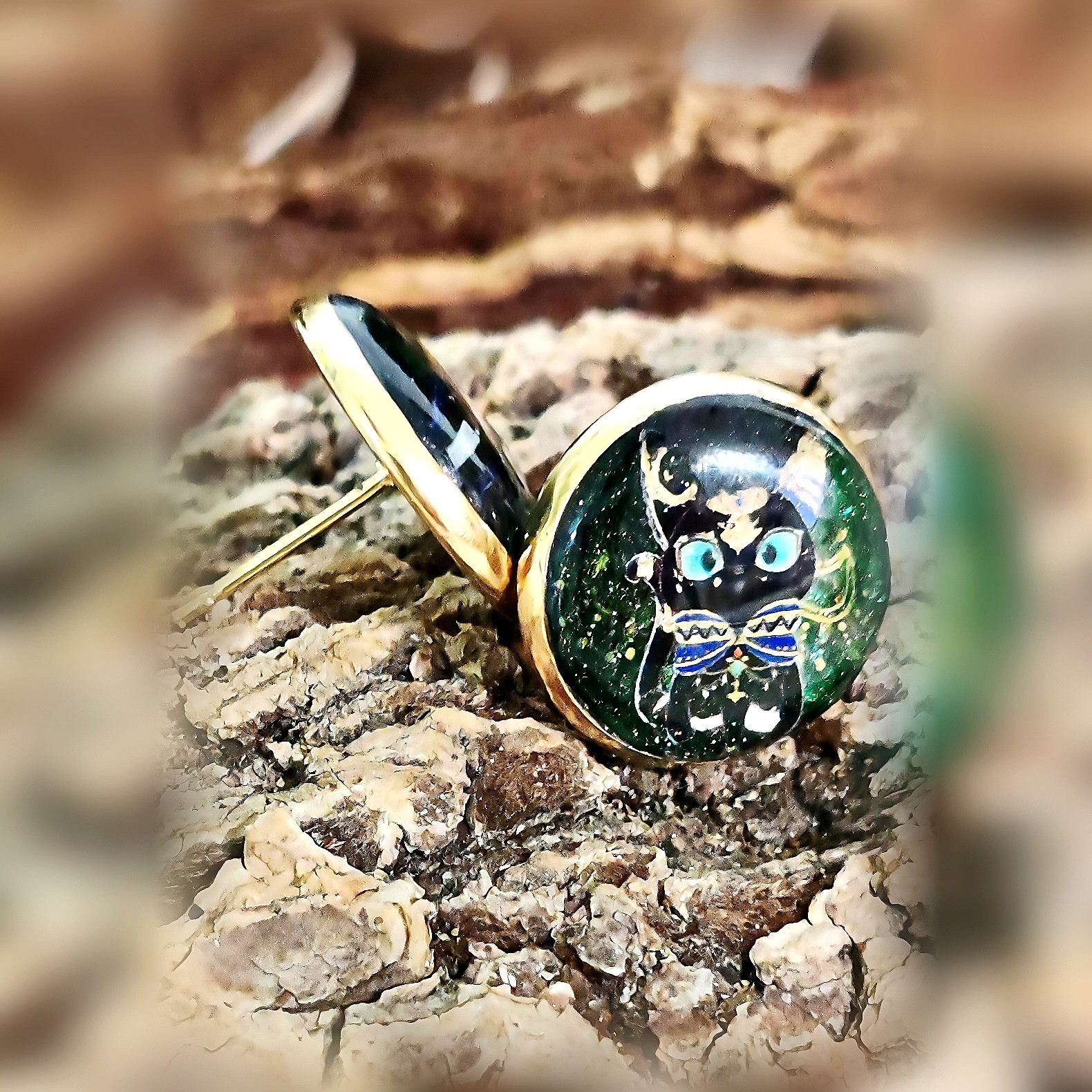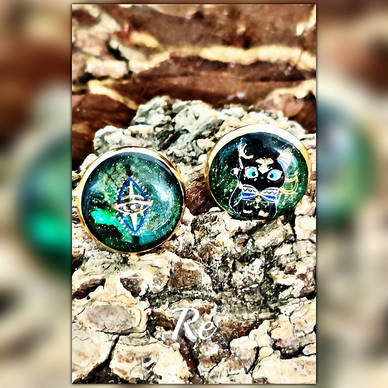 Émail vert profond, éclat doré, œil solaire posé sur une éclipse bleu indigo, accompagné du chat sacré assis entouré de symboles.