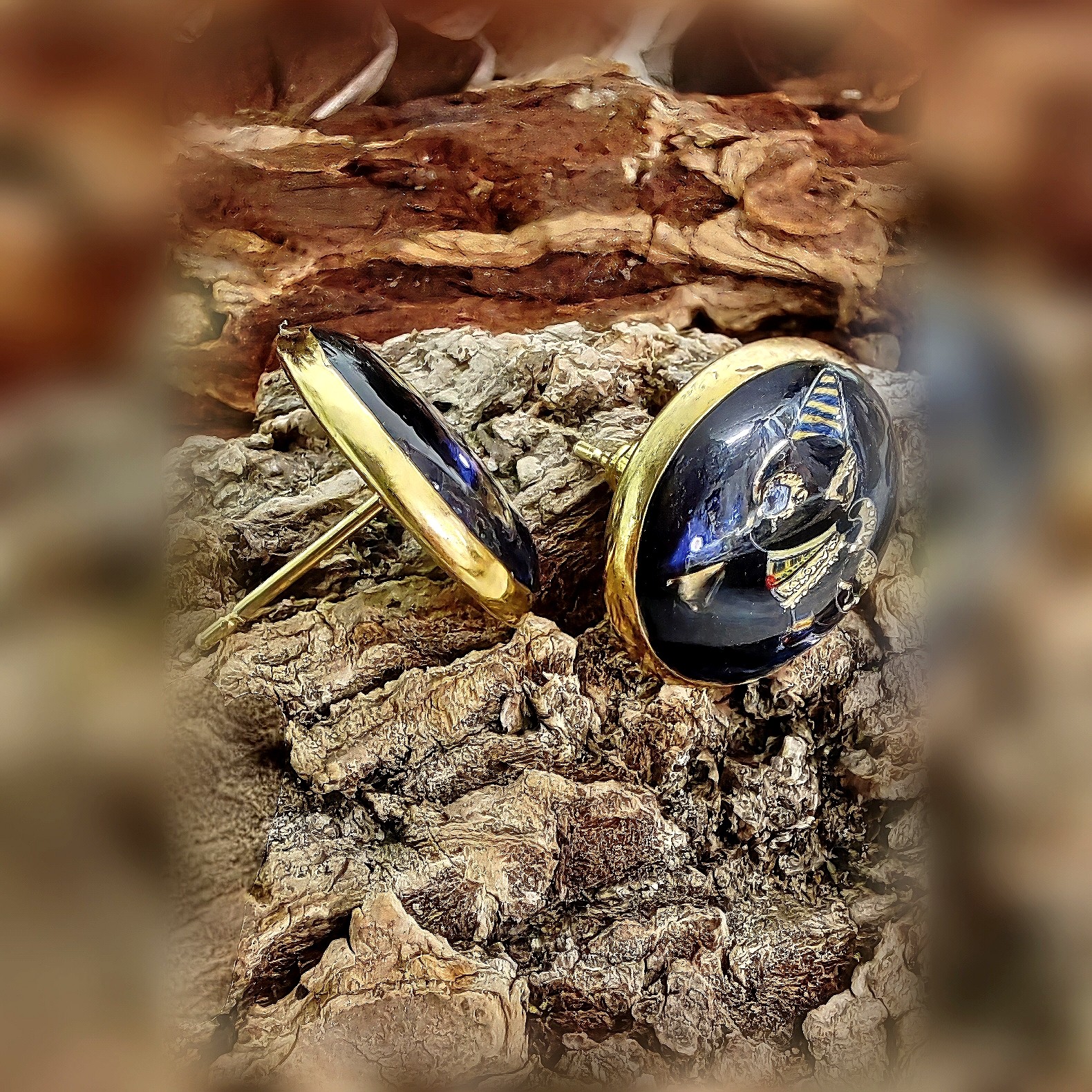 Ces bijoux émaillés, conçus en pièce unique, mêlent éclats dorés, nuances indigo, frises antiques et motifs divins pour donner naissance à trois créations exceptionnelles : Osiris, Ré et Ankh. Chaque clou d’oreille est travaillé minutieusement, poli, puis présenté dans un écrin personnalisé accompagné de sa carte d’identification numérotée – gage d’authenticité et d’exception.