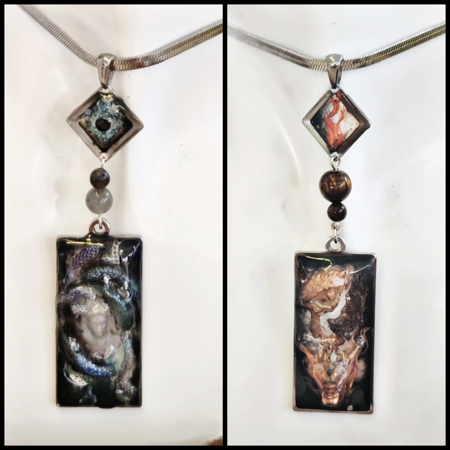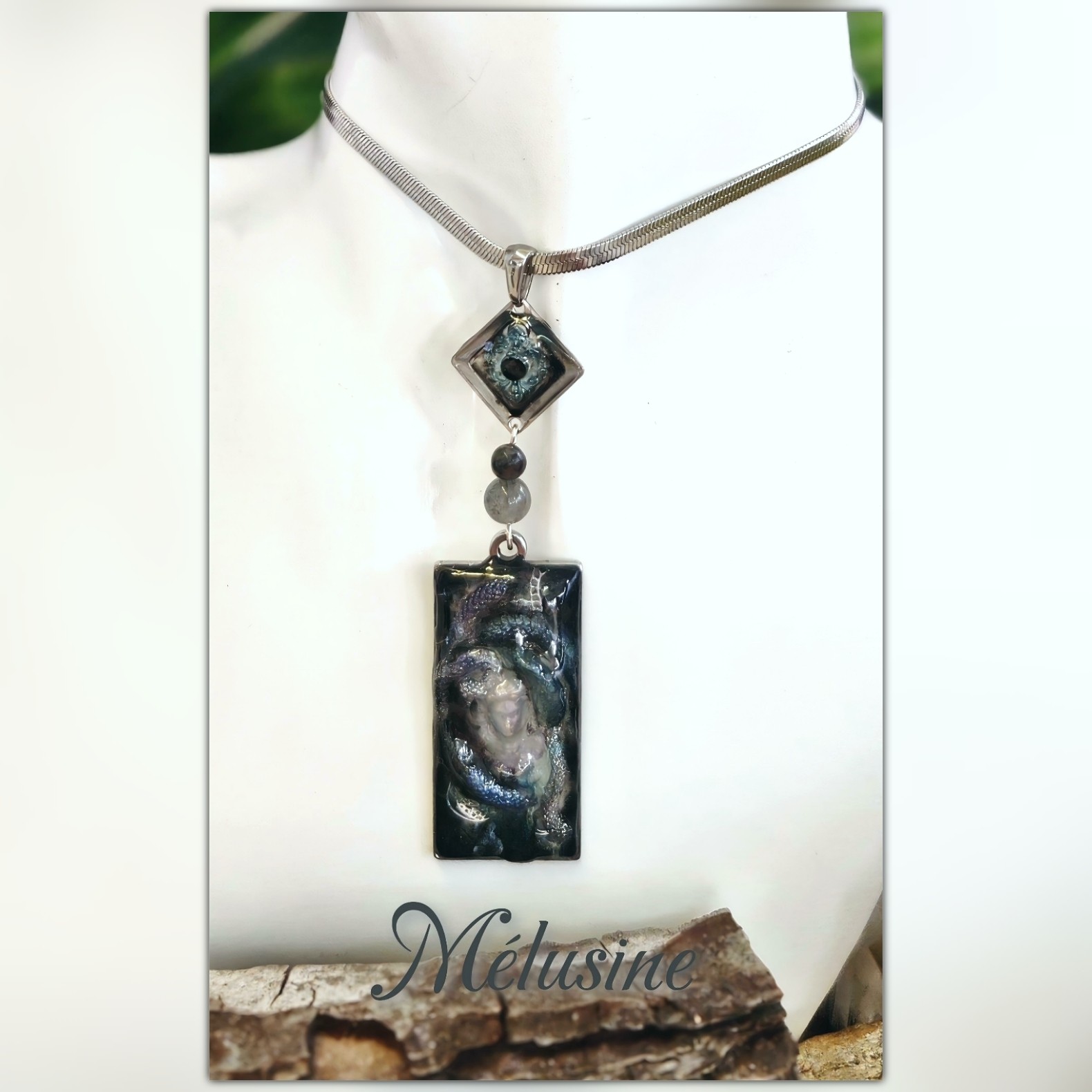 Le médaillon en forme de losange révèle un symbole délicat inspiré de l’onde et de la transformation, tandis que le médaillon rectangulaire laisse apparaître le visage de Mélusine en 3D entouré de sa queue reptilienne , sculptée en résine pigmentée de gris bleuté nacré, comme suspendue dans l’eau d’ancre des sous-terrains de sa demeure .