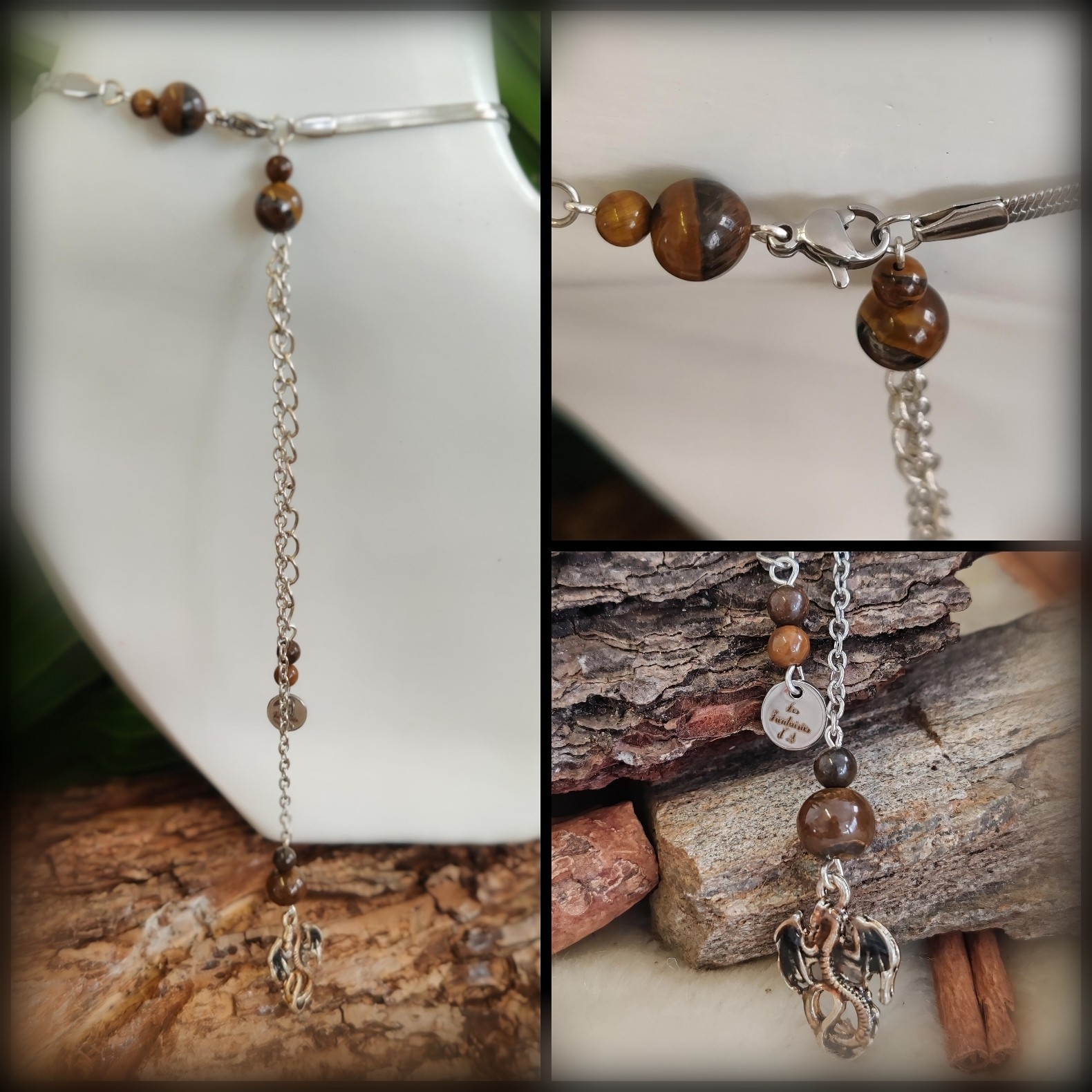 Ses perles en Œil de Tigre, plus denses et plus profondes, rappellent la minéralité des grottes englouties et le souffle ancien des dragons aquatiques.