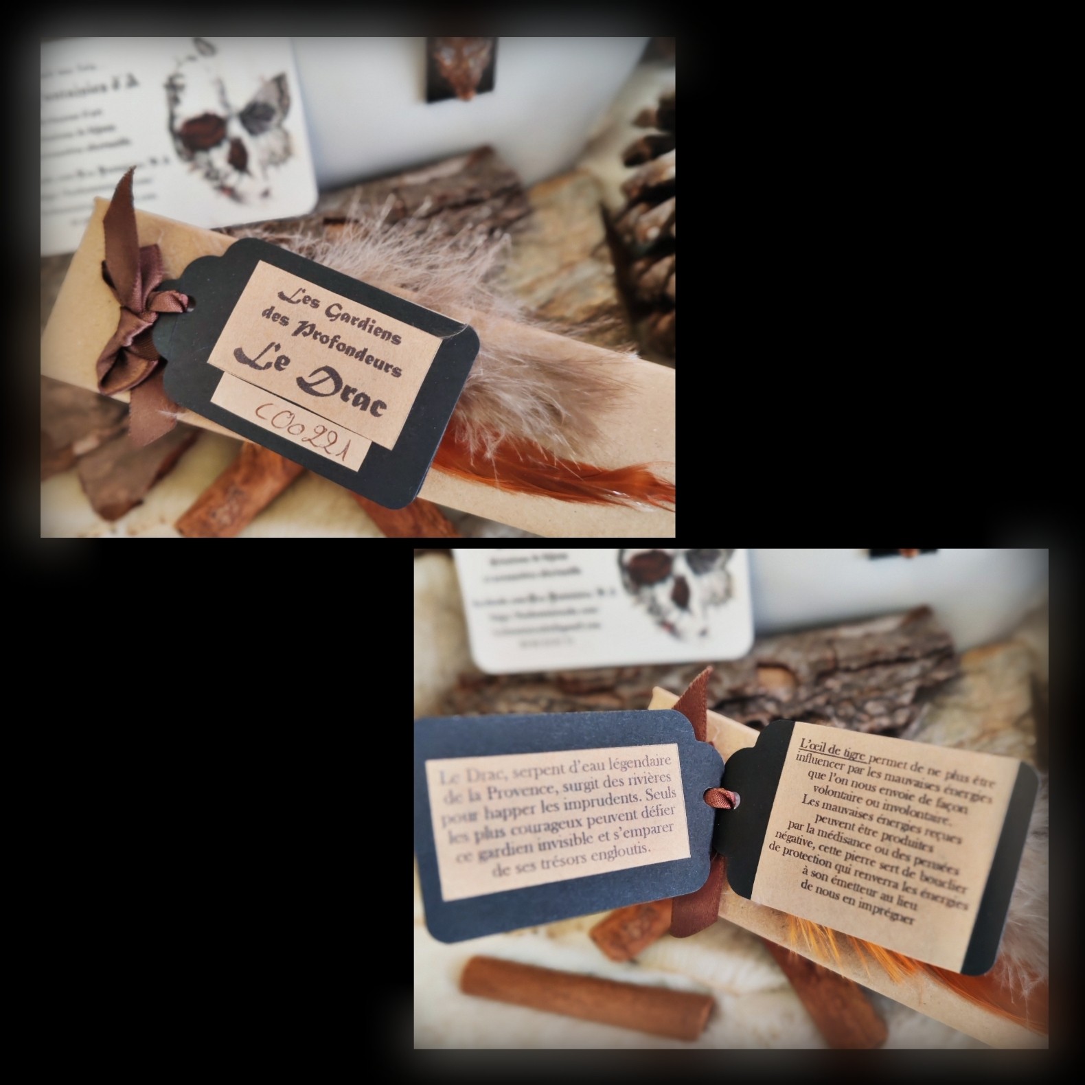 Le médaillon en losange dévoile l’oeil du dragon en relief, tandis que le médaillon rectangulaire révèle le Drac en 3D, sculpté à partir de résine dans un rendu saisissant : œil de dragon, crêtes, mouvement de nage… chaque détail semble vivant sous l’émail transparent aux teintes brunes et noire.