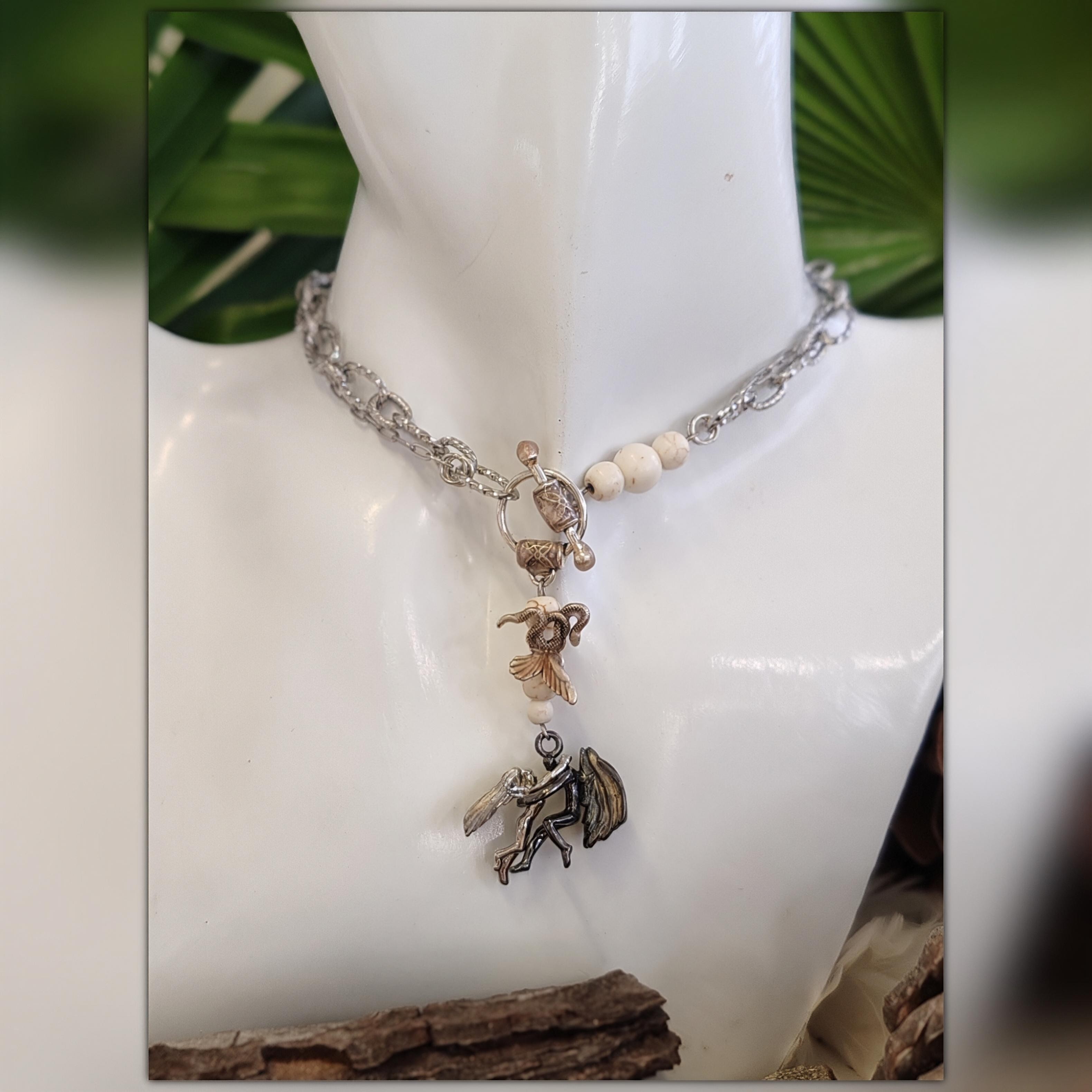 Le collier se ferme par une fermeture en T émaillée, assortie aux couleurs des ailes des anges, reliée à une nouvelle enfilade de perles en gemmes naturelles, assurant une continuité visuelle et symbolique sur l’ensemble de la création.