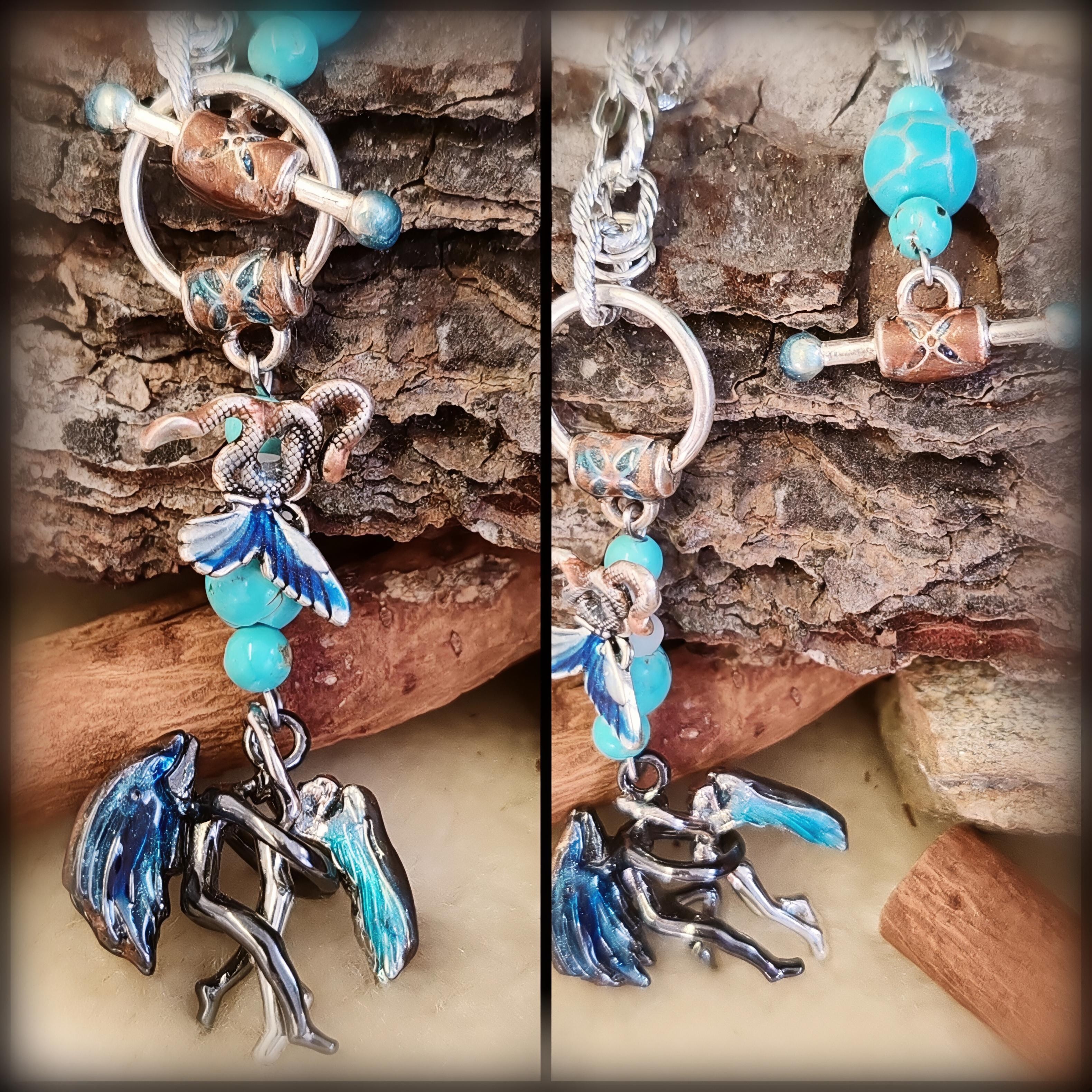 Ces anges mythiques sont suspendus à une composition symbolique mêlant perles en gemmes, papillon et serpent, entrecroisés dans un motif puissant évoquant la métamorphose, l’équilibre et l’éternité. L’ensemble est sublimé par un émaillage artisanal, unique à chaque pièce.