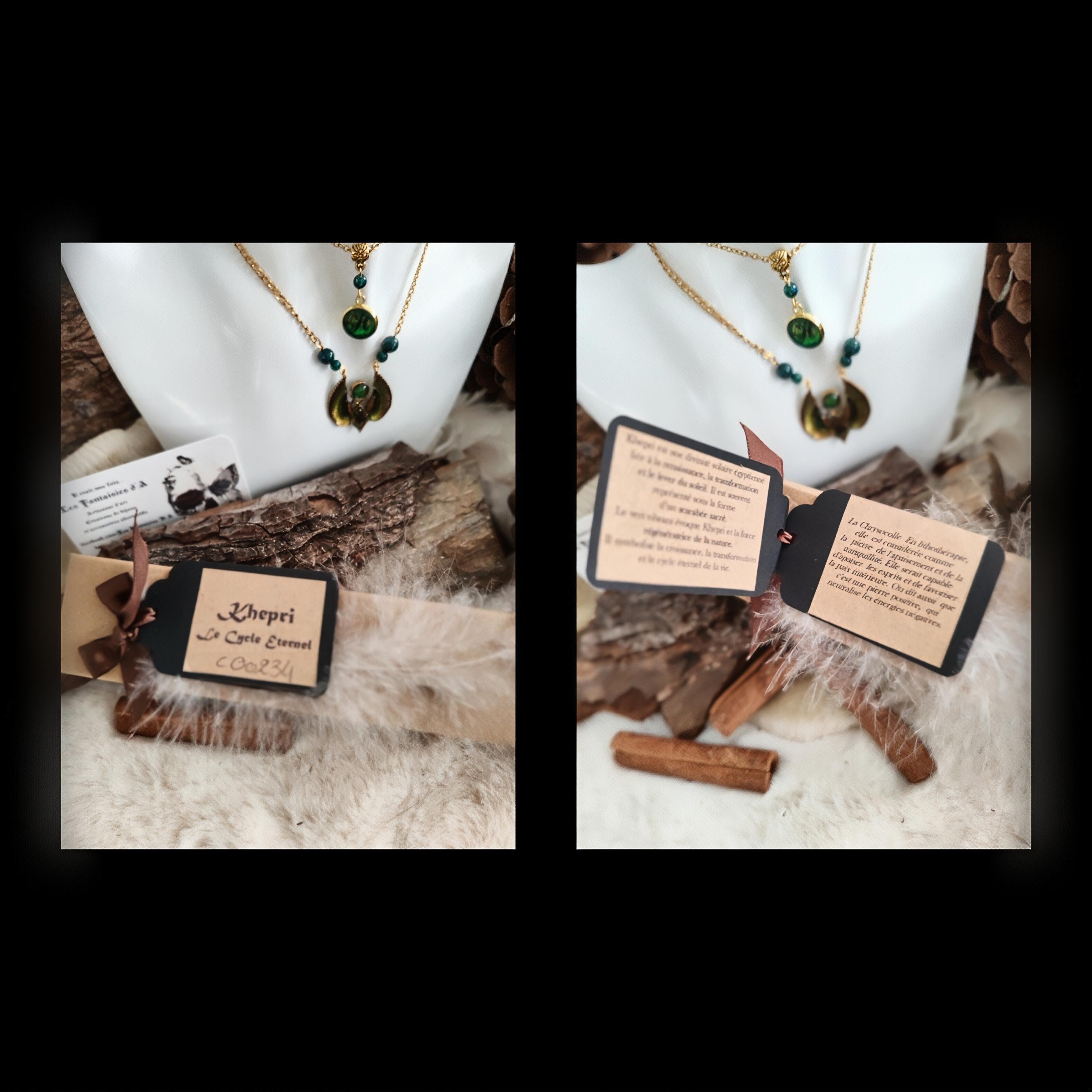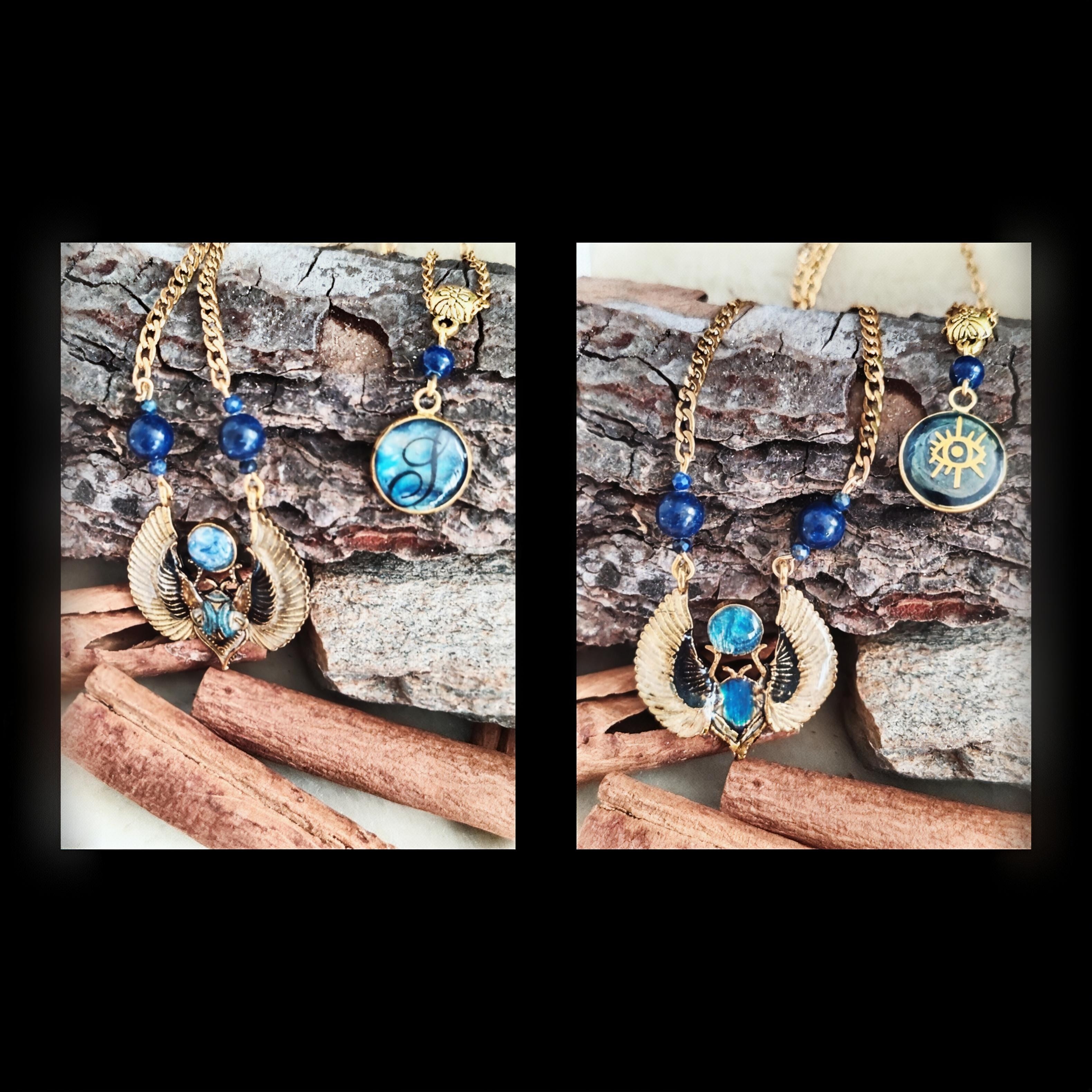 En leur centre, le scarabée sacré Khepri déploie ses ailes, symbole de renaissance et de transformation.