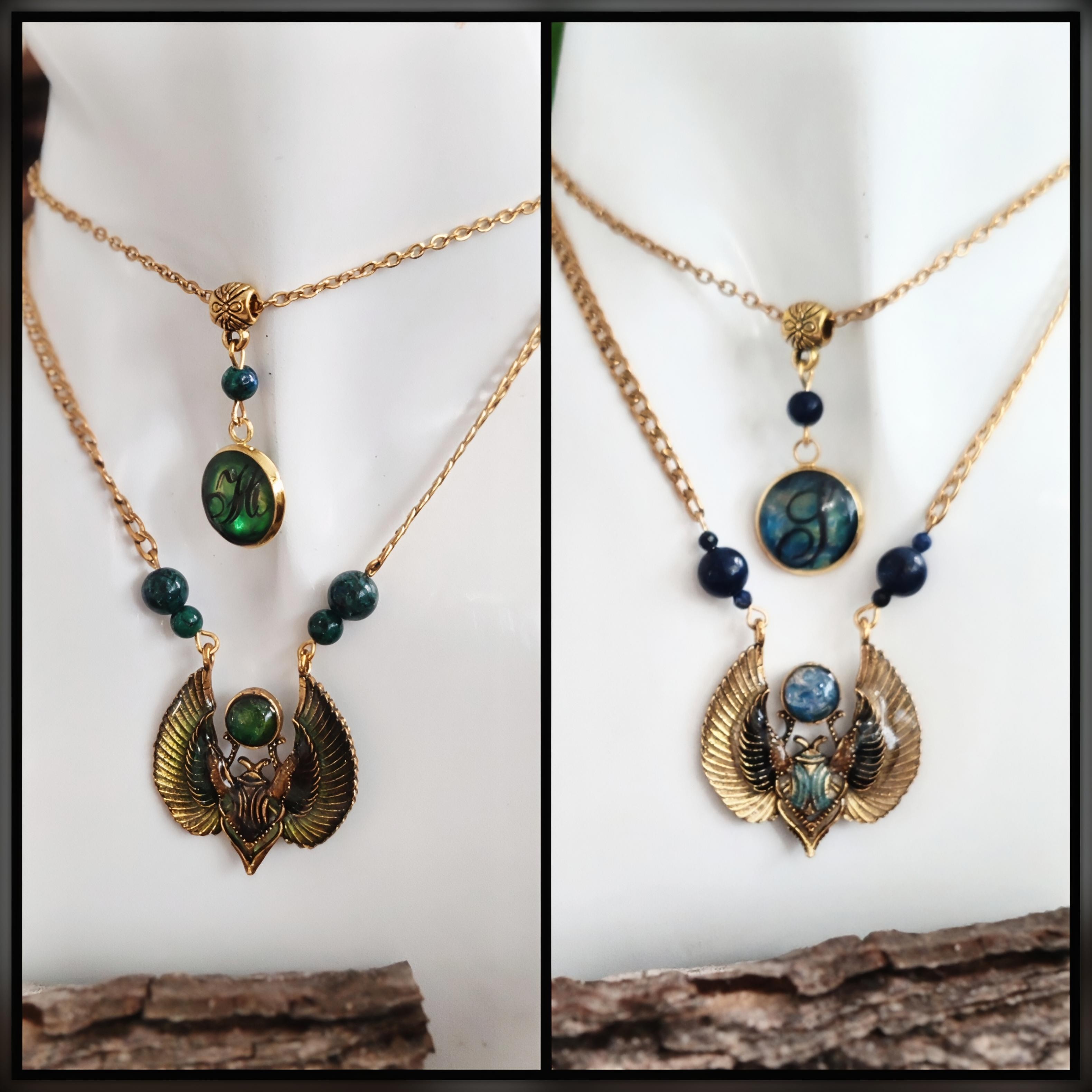 Le scarabée est suspendu à une enfilade de perles naturelles, assemblées à la main avec précision.
